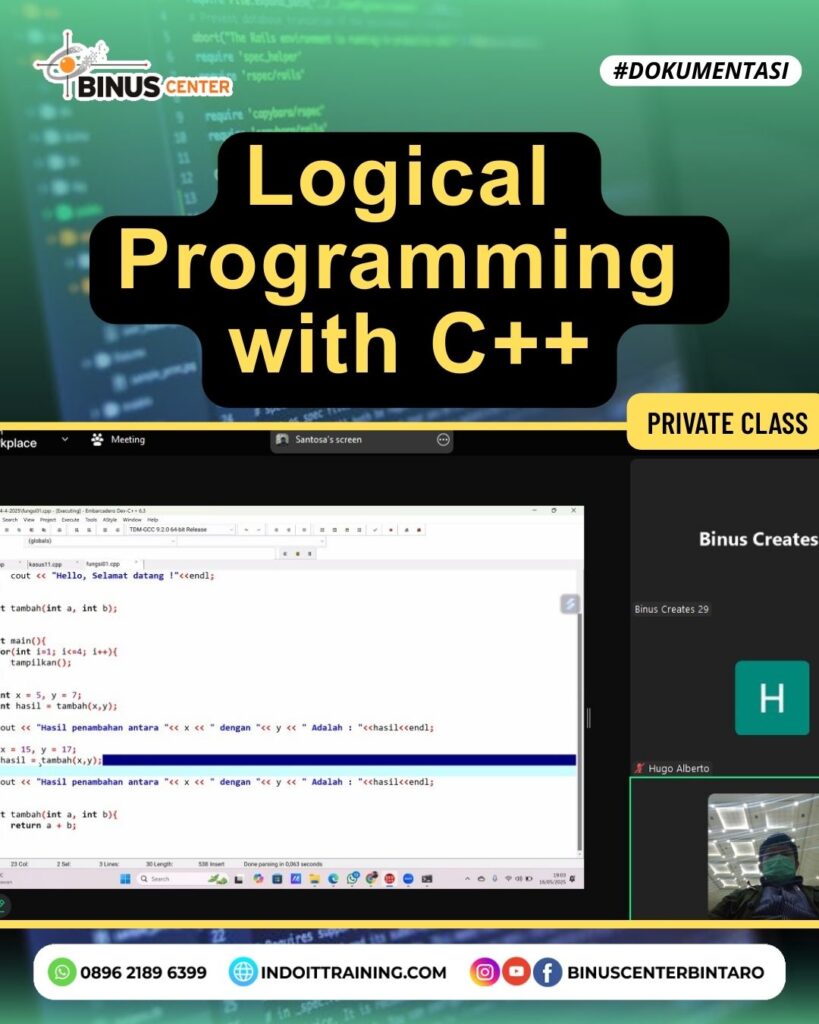 Di dunia pengembangan perangkat lunak, fondasi yang kuat dalam logika pemrograman adalah kunci. BINUS Center Bintaro dengan bangga mempersembahkan Private Class “Logical Programming with C++,” yang baru-baru ini diikuti oleh Kak Hugo. Kelas ini dirancang khusus untuk membantu Anda memahami dasar-dasar pemrograman logika menggunakan bahasa C++.