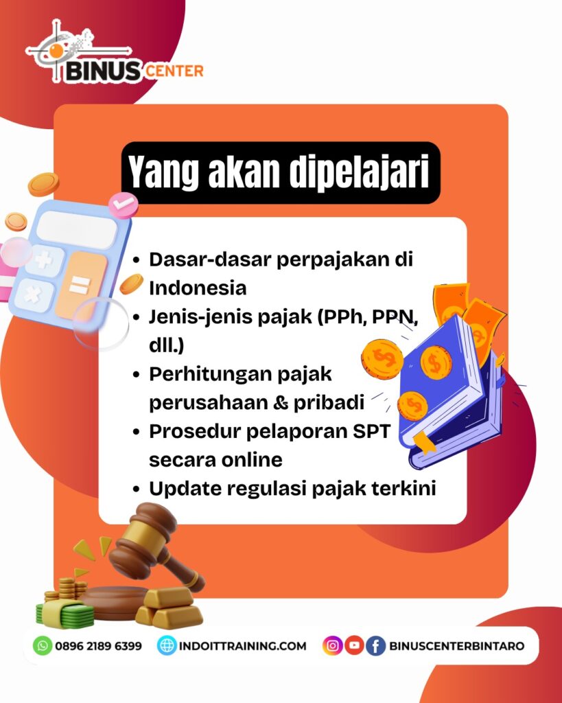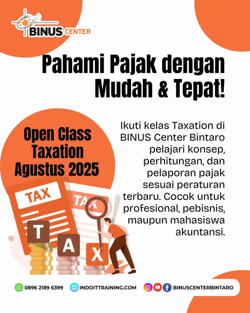 Pahami pajak dengan mudah dan tepat! Ikuti Kelas Taxation di BINUS Center Bintaro dan kuasai konsep, perhitungan, serta pelaporan pajak sesuai peraturan terbaru. Kelas ini sangat cocok untuk profesional, pebisnis, maupun mahasiswa akuntansi.
