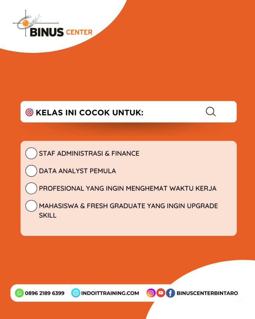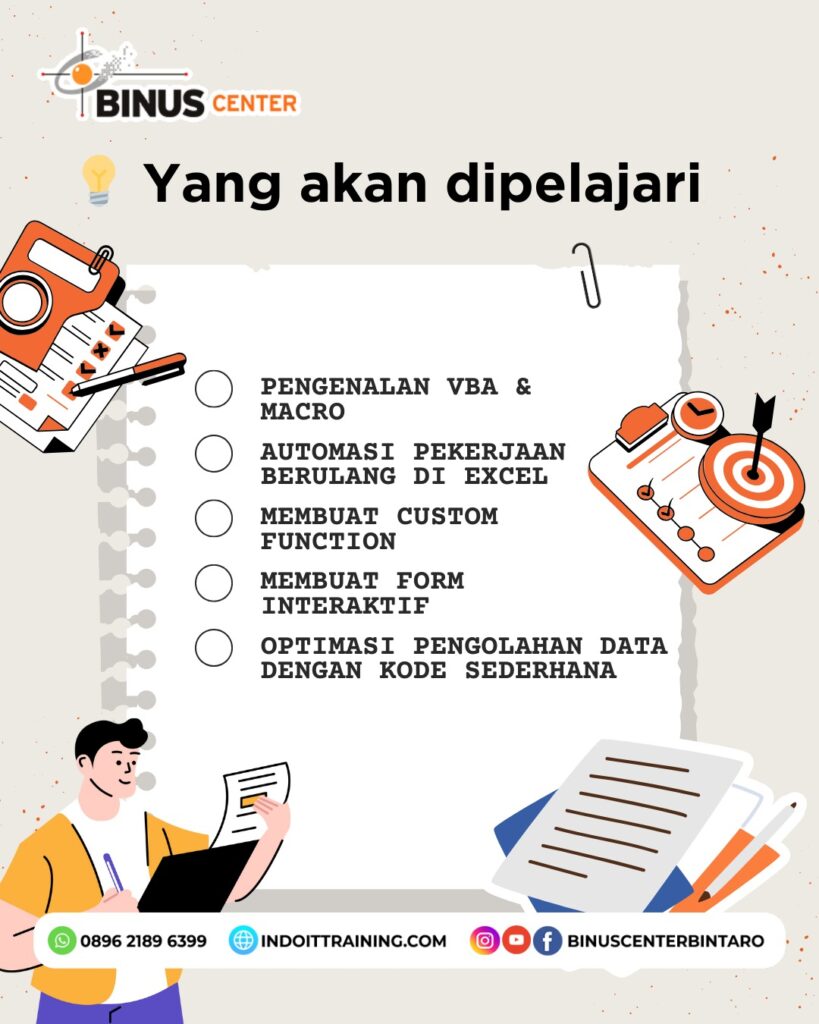 Ikuti kursus VBA & Macro Processing with Microsoft Excel di BINUS CENTER Bintaro. Dengan menguasai skill ini, Anda dapat menghemat waktu dan mengotomatiskan pekerjaan yang berulang di Excel, menjadikannya salah satu keterampilan yang paling dicari di dunia kerja!